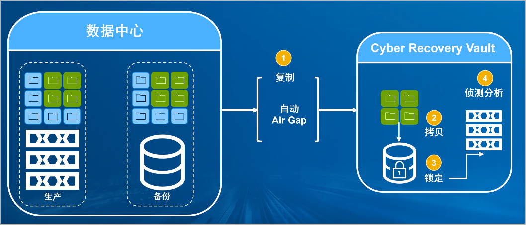 sbobet利记(中国)防勒索病毒方案将生产中心备份数据复制到Vault区,复制后网络自动断开实现弹性隔离。Vault区的数据快速拷贝,并对拷贝版本加锁(在锁定期数据不允许删除和修改)。Vault沙箱内对拷贝版本进行扫描分析,验证数据是否完好。